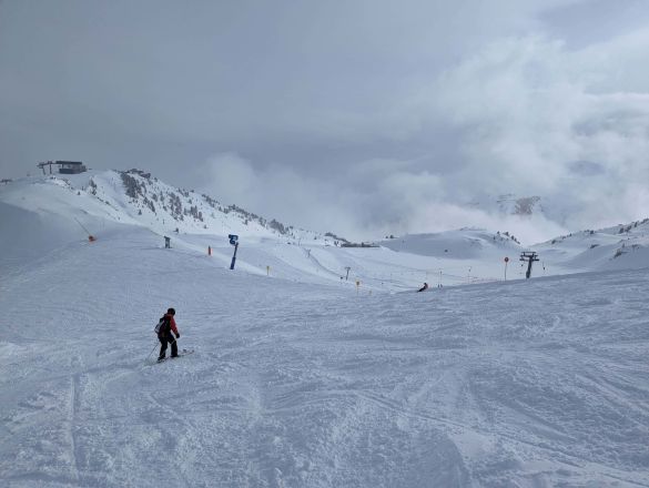 Ganz oben und so lange wir noch nicht über den Nachmittag hinaus sind, ergaben sich noch gute Pistenverhältnisse. Die klassischen Nebelschwaden und Windstöße, sowie charakteristischen Sulz- und Eisplatten für die Spätsaison waren natürlich dabei - aber das war ja eigentlich auch klar.
